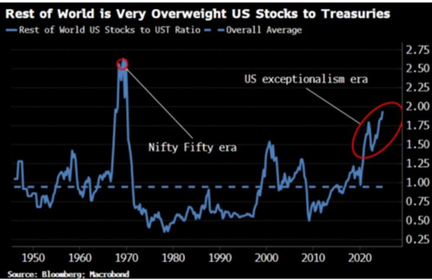 One positive thing will come from all of this: Canada will hopefully (likely) change its ways. As will most other countries. The trust with the US is now broken, and is unlikely to go back to exactly the way it was. The tides have shifted. And so should most portfolios – this has investment implications. Everyone has fallen all over themselves to own America everything which has worked until 2025, but don’t expect that ‘American Exceptionalism’ will continue to prevail. One financial writer puts it well in noting that “there is no going back. US financial assets will be for sale for years to come. We took decades for the world to get this overweight American stocks and bonds. It won’t be unwound in a couple of weeks.” The more the US administration weaponizes trade and the US dollar, the greater the risk that it prompts active capital repatriation as well.