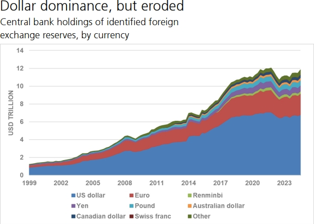 The US dollar's dominance as the leading reserve currency is likely to continue to fade as its relative advantages lessen. The fading importance of any reserve currency's status is also likely to continue, as global trade in goods falls as a share of global economic activity. The dollar as a reserve is therefore likely to be a falling share of a falling market. However, the dollar is not going to be replaced, and it is very unlikely that any single alternative will emerge. The parallel is perhaps to the declining importance of sterling in the 1930s with several other currencies playing a larger role, rather than the replacement of sterling as the leading reserve currency in 1947.”