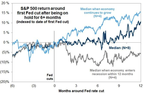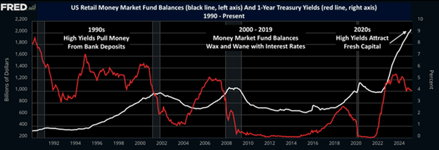 Finally, here’s an interesting take on all that capital that is ‘sitting on the sidelines’, with the implication that it is ready to buy more stocks. "Many market commentators think of money market fund balances as capital that will migrate to stocks at some point (“dry powder” for a rally), but history shows this only happens when short term rates decline. With the Fed on hold for now and only expected to cut rates modestly this year (50 or maybe 75 basis points), it is hard to see this “sideline” capital getting into the game any time soon. " (Data Trek)
