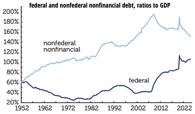 Intentionally or not, they’ve put their debt “out of sight, out of mind.” This lets them keep merrily spending and investing in ways they probably wouldn’t if they knew how much debt they really had. The federal part is someone else’s problem… complacency will continue until it doesn’t. Then we may see a Minsky Moment…