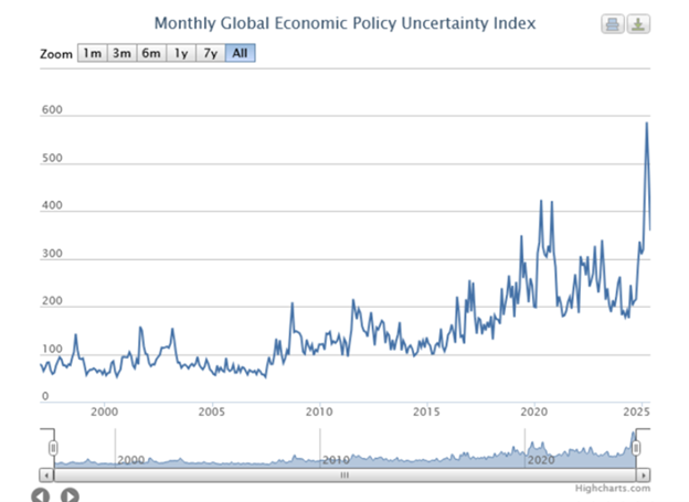 But this “show me” attitude is also reaching historical extremes. The S&P 500 is trading more than 23x 2025 EPS of $265 and more than 21x 2026 EPS of $298. Those are historically very high and unsustainable valuations, and if we think about them in the context of the greatest shake up to the global trading system in nearly 50 years, it seems quite rich.