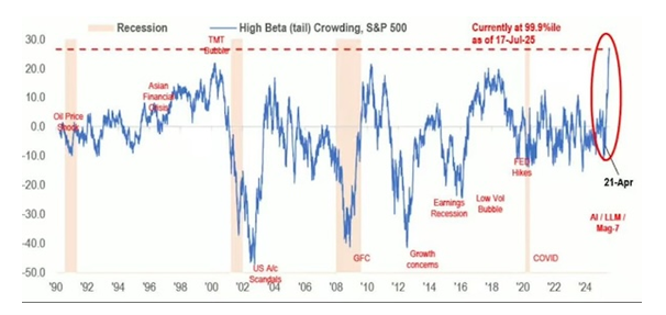 Along with equity valuations making new highs, so has equity speculation. “The latest bout of extreme crowding — currently in the 100th percentile — is in high-beta stocks. And this spans both riskier low value alongside speculative growth plays,” notes JP Morgan: