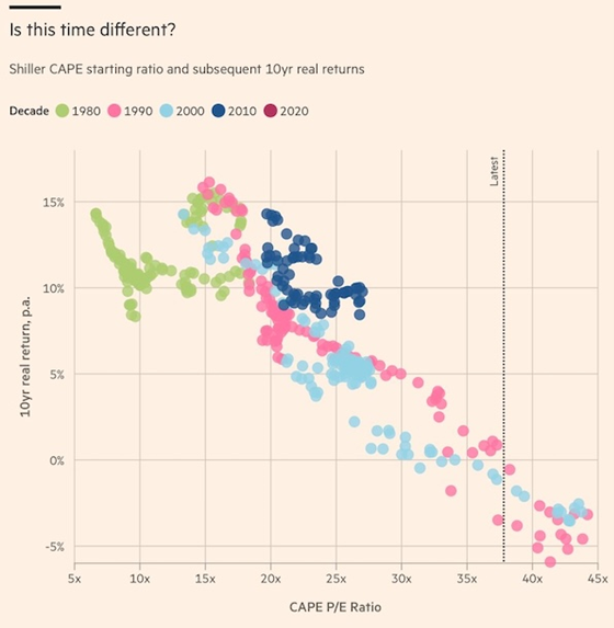 Valuations are clearly at high levels (in the US), and The Financial Times notes that forward returns are challenged from here. “Just because investors have never before realised positive 10-year real returns when investing at CAPE above 37.3x, doesn’t mean they can’t. This time may be different.”