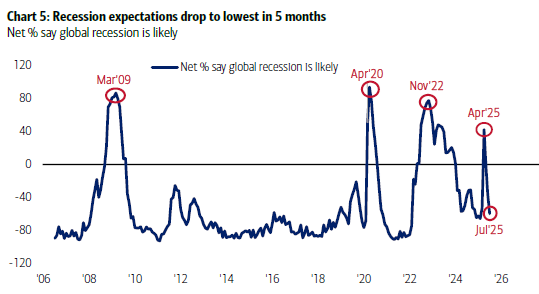 Speaking of complacency, recession expectations have dropped again, oddly enough.