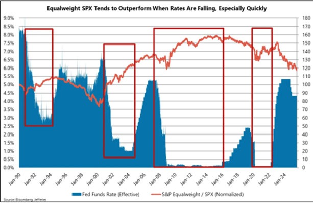 So, we may want to consider changing our US equity exposures (and we have for our clients)… S&P Equal Weight has outperformed S&P Cap Weight during easing cycles: