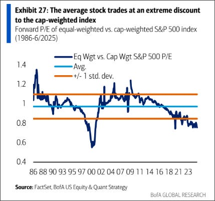 - The top 10 S&P 500 stocks trade at an average Price-to-Earnings Ratio of 26X (2025 earnings) vs. 20X for the “rest of the market.”