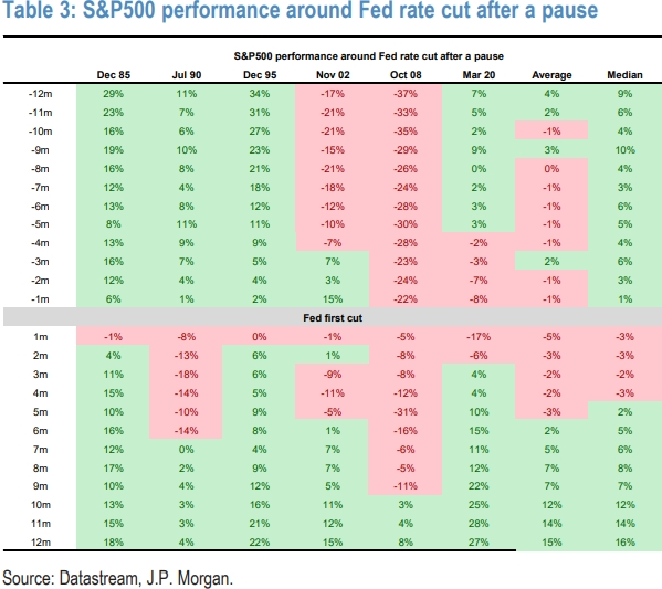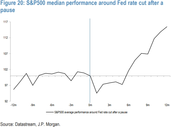 In the 6 instances since the 80’s when the Fed restarted easing after a pause, the S&P 500 was down every single time in the month following the cut, and would show a positive performance further down the line: