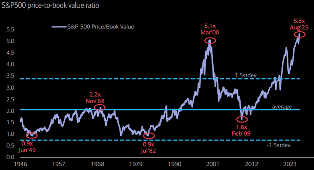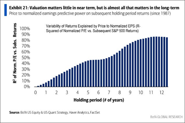 Valuations are undeniably high, in both stocks and bonds. The very low real earnings yield, matched with a high price/earnings multiple, piles on with the quite high price-to-book ratio of the S&P (highest ever today at 5.3x; and it was 5.1x in March of 2000). Is price-to-book a great valuation indicator? Not necessarily – capital intensities have changed significantly and profit margins are higher than in years past, the index composition is evolving, and tangible vs. intangible asset weightings are as well. But it is a data point along several other data points that point to the same theme of expensive asset prices. Valuation matters!