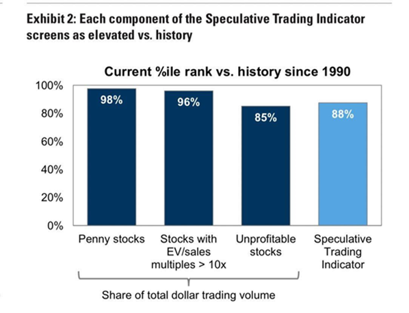 Investor complacency abounds, and speculative behaviour is back with a vengeance in certain areas of the markets. Goldman's Speculative Trading Indicator sits at an 88th percentile ranking, with data going back to 1990.