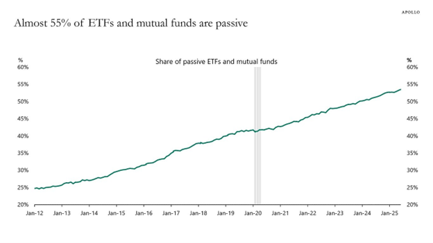 Passive investing has been wildly popular and has worked – so far. But Torsten at Apollo (one of the most respected out there) notes that “the amount of money in passive investing continues to grow. There are three consequences of this development: 1) Reduced market efficiency and price discovery 2) Increased market concentration and volatility 3) Growing correlation and systemic risk”.