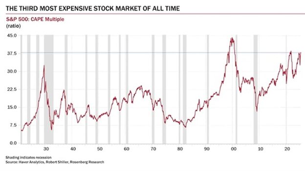 Stock market valuations provide a guidepost as to what future returns may bring. Stock market valuations have reached some truly rarified levels. The Shiller cyclically adjusted price-to-earnings ratio is hovering around 37.5x. And, as David Rosenberg points out, over 35 is, “the only cutoff point where every single time [the forward return] is negative.”