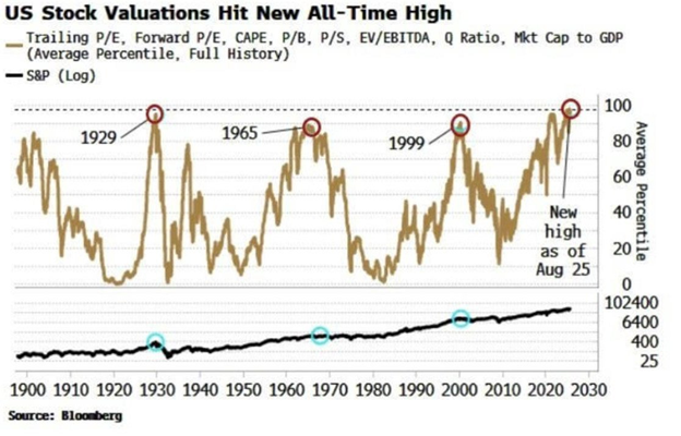 U.S. stocks have reached a new record valuation, exceeding those levels reached in both 1929 and 1999.