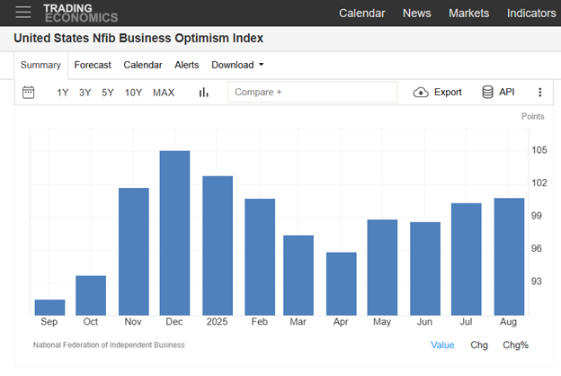 The Fed is boosting monetary liquidity, which is good for asset prices. The interest rate cut(s) should boost CEO and business owner confidence. Small business sentiment is rocking (see chart below). Higher business activity obviously means improved hiring. The US housing market is shaky, but interest rate cuts support that sector and should reduce spread of mortgage rates to bonds. As well, these cuts make holding cash less attractive, which is risk-on.