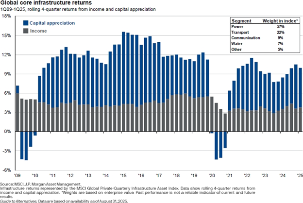 - Consistent Cash Distribution: Infrastructure assets may provide an opportunity for potential consistent income and favorable risk-adjusted returns often supported by long-term contracts or regulated revenues.