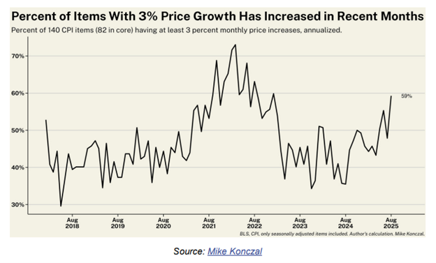 Inflation has remained stubborn, and making central bankers jobs difficult. This chart shows the percentage of the 140 items the Consumer Price Index tracks with 3% or greater price growth in the last 3 months. Similar to the stock market’s advance/decline line, this helps reveal the breadth of inflation pressure. As you can see, it’s rising. The last time 59% of the CPI items were rising 3% or more was in late 2021, and it got considerably worse from there. Hopefully not this time.