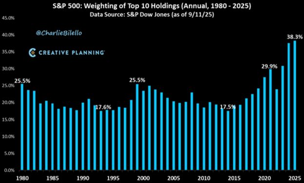 Markets are becoming more concentrated by the day, making all that passive investing and indexing less diversified and inciting other market risks. Top 10 stocks in the S&P500 are almost 40% of it!