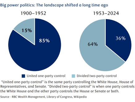 With financial markets near all-time highs, many investors do not seem too concerned regarding the outcome of the election. Financial markets prefer to have checks and balances in government (ie representation of both parties in the House, Senate and White House), so a one-party sweep would be an unfavourable outcome. For example, the difference in tax proposals is stark. Currently, the basic corporate tax rate is 21%. The Republicans want to move it to 15% and the Democrats want to move it to 28%. Without sweeping the House, Senate and White House, neither candidate would be able to make radical changes if they faced gridlock. The probability of a one-party sweep is low, and history would suggest it is unlikely. The picture below illustrates that, since 1953, one party has had united control only approximately one third of the time.