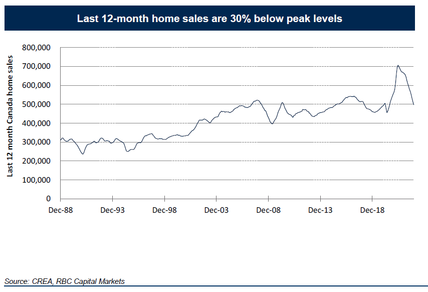 Au cours des 12 derniers mois au Canada, le volume de vente de maisons est en chute de près de 30 % pour se situer à un niveau similaire à celui d'avant la pandémie.