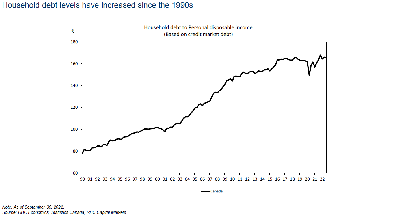 Nous ne disons PAS qu'il n'y a pas de risque. Un ratio qui nous préoccupe est le ratio de la dette des ménages comparativement à leur revenu. Aujourd'hui, ce ratio au Canada est à un sommet de 30 ans à 160 %.