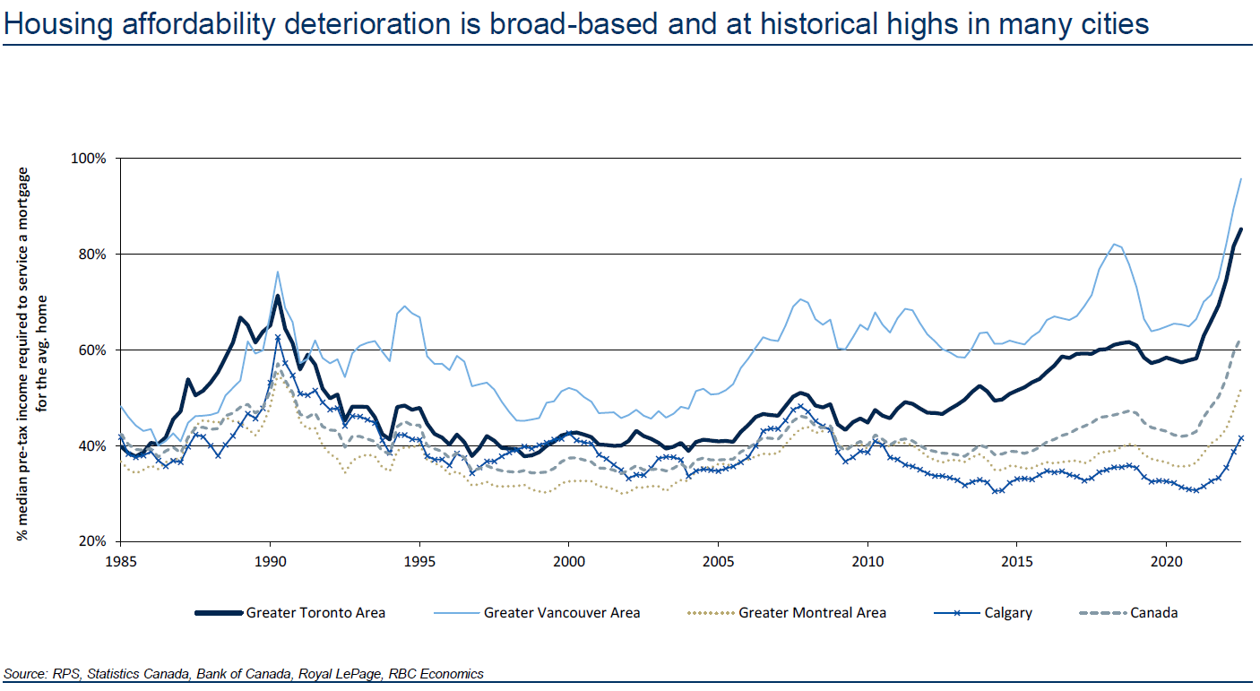 L'abordabilité du logement est encore difficile au Canada. Pour une maison au prix médian d'une maison individuelle au Canada (375,000$ en 2022), vous avez besoin de plus de 65 % d'un revenu médian avant impôt (38,400$ pour 2022) pour assurer le service d'un prêt hypothécaire. À Toronto et à Vancouver, ce chiffre est plus proche de 80 %.