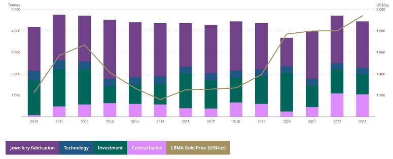 Source: World Gold Council. December 31, 2023. Spot gold price as of December 31, 2023, was $1940.50 (US$/Oz). LBMA: London Bullion Market Association.