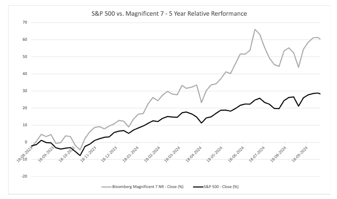 When AI is fully developed and implemented with critical thinking, the impact could be very scary for the world as we know it. Thousands, if not millions of jobs are potentially at risk of being lost to smarter automation and processes. Unions know this and are asking for job guarantees. Medical procedures could benefit, however, as human errors should be greatly reduced. Of course, here are a lot of issues involved in fully implementing AI, the first being legislation to curb its limits. A major issue is that AI requires enormous amounts of electricity to power data centres. One estimate is that 20% to 25% of today’s electricity usage could be required to power these. Microsoft data centre requirements alone have spurred re-commissioning of one of the famous Three Mile Nuclear reactors to power their data centres (Three Mile Island Nuclear in Pennsylvania was the facility that suffered a partial meltdown in 1979). Further, data centres require enormous amounts of water to cool the computer chips. Does AI mean that we are embarking on a new age of enlightenment? I don’t think so, because voters will elect politicians that protect our way of life. Implementation of AI will cause misinformation to be run rampant with all sorts of implications. However, legislation is needed to limit AI to uses that are beneficial. But the race is on for early adopting businesses to implement efficiencies to gain advantage on competitors, and the best performing stocks are in AI, which have powered the U.S. stock markets higher (see chart).