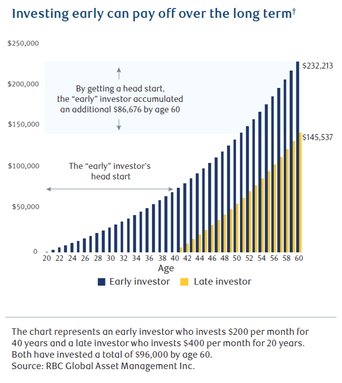 The value changes as investors increase their wealth. In the earlier stages of wealth accumulation, an advisor plays a key role in helping investors save more by staying on track with contributions, developing a financial plan to adhere to, educating investors on the use of registered investment accounts, and hopefully doing so early on. The diagram below from RBC Global Asset Management shows how engaging professional advice early leads to significantly increased lifetime wealth accumulation using just a 4% annual average return on investment.