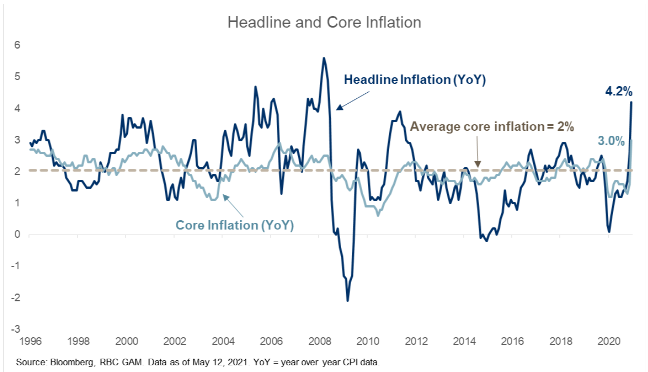 Over the past several months, inflation has been on the minds of many investors. While lumber, gold and copper prices skyrocket, central banks including the US Federal Reserve and Bank of Canada ensure us that inflation will be "transitory"; a sentiment that runs counter to traditional notions that unprecedented fiscal and monetary stimulus are bound to drive prices increasingly upward. With the April 2021 headline and core inflation readings at 4.2% and 3% year over year, respectively on an annualized basis being the highest readings since the Great Recession, it's easy to question central banks' assurances. Recall as well that investors had the same prediction during the 2008 financial crisis, only for the US Federal Reserve to struggle in keeping the rate of inflation near the 2% target; And that it was April of 2020 when the world economy shut down and oil prices briefly turned negative.