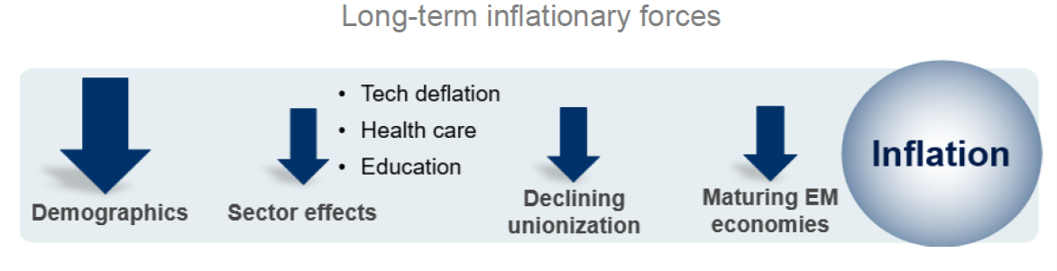 Macro trends would suggest demographic factors such as an aging population and slower population growth should present deflationary forces, as well as advancements in technology increasing productivity. The combination of maturing economies in emerging markets and expected declines in unionization as a longer-term affect of production on-shoring should also exert downward pressure. While pressure from the aforementioned short and medium term factors may exert greater force on prices over those terms, long-term trends are expected to persist long after they have abated.