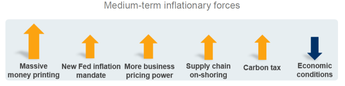 Krystyne Manzer, Vice President and Portfolio Specialist as RBC Global Asset Management wrote that in the medium-term, the amount of money being printed by central banks is arguably the biggest inflationary risk. In addition, a small change to the language around the US Federal Reserve's inflation target presents a tailwind for inflation; now targeting a long-term average of 2% inflation as opposed to the previous annual 2% inflation target, the central bank will need to overshoot the 2% level to compensate for their <2% average over the past decade. Additional factors such as supply chain on-shoring threaten to put upward pressure on prices as many goods cost more to produce in North America than overseas. New carbon pricing policies also threaten to drive up prices for carbon emitters as we transition to a net-zero economy.