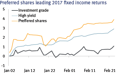 Credit spreads have moved to their tightest levels in 18 months in Canada and compensation for assuming BBB credit risk over A has narrowed to the lowest level in nearly three years. As a result, we recommend investors move to higher grade corporate credit. Year to date, preferred shares’ returns have been the strongest in the fixed income space: