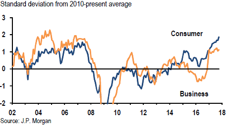 Animal spirits are stirring. Business and consumer confidence have jumped since mid-2016 and are back to pre-financial crisis levels. Together with the rebound in profits, the rise in business confidence has revived capital spending. The mix of rising household confidence, strong labor markets, and wealth increases has delivered solid consumer spending gains despite some loss in purchasing power from the rise in CPI inflation.