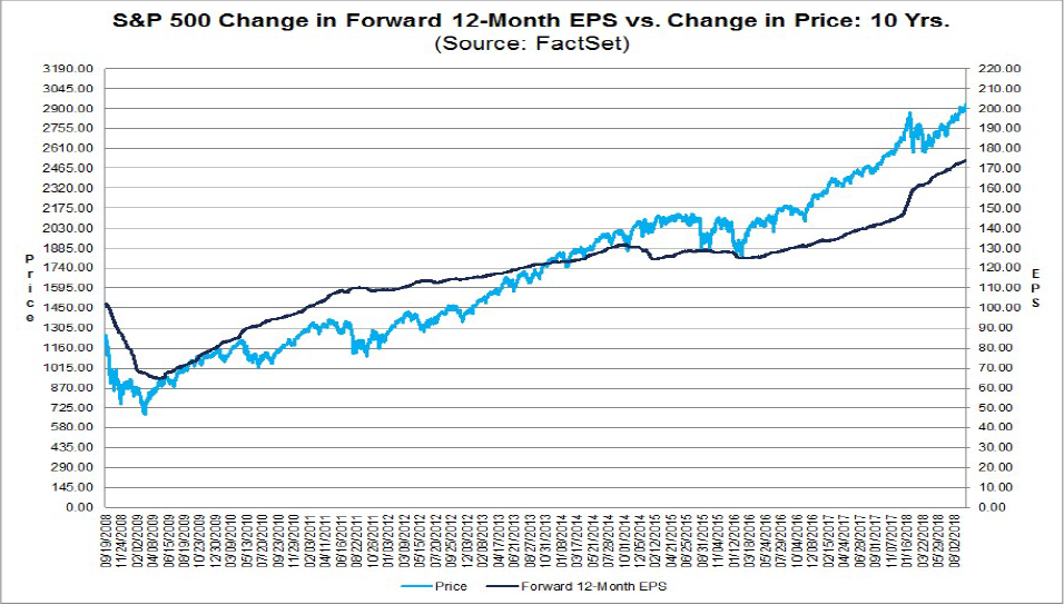 S&P500 Earnings per Share and S&P500 Price Change from 2008 to 2018 (Exhibit 2)