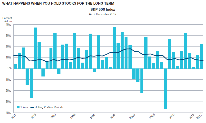 Source: Morningstar Zephyr. Price return calculations include dividends and capital gains. Annual returns beginning in calendar year 1970. Rolling 20-year data beginning in 1950. Past performance cannot guarantee future results. Source for Bloomberg Barclays index data: Bloomberg Index Services Ltd. Copyright 2017.