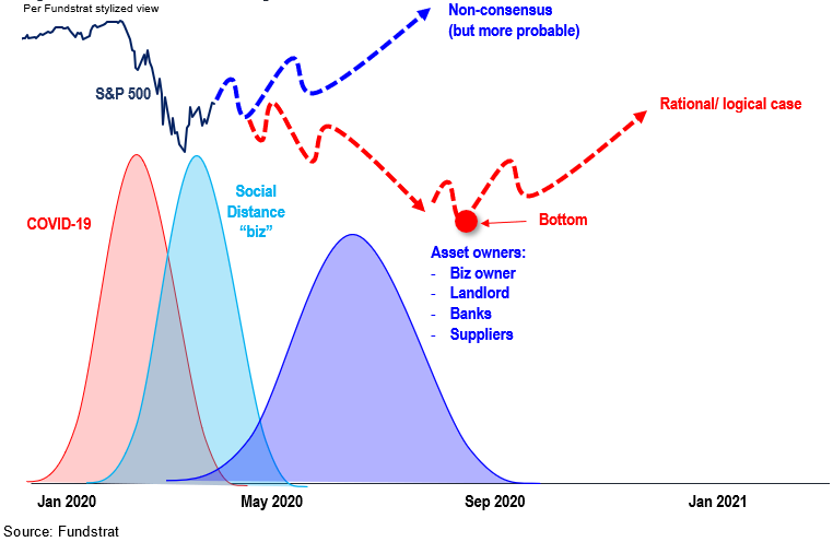 Courtesy of Fundstrat, The red line shows how the markets should behave if it were more aligned to the general economy and the blue trajectory shows how it could behave in anticipation of a recovery. So far we have been on the blue path.