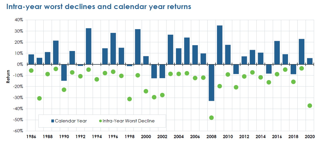 Even though market returns are positive 68% of the time (S&P500 annual returns from 1927 -2020), a market pullback of 15% or more is common to historical observance.