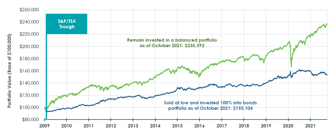 Investors that try to time the markets by attempting to sell at highs and buy in at lows often detract from the portfolio performance overall. It is the most detrimental when investors panic and sell at market lows.