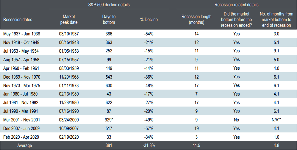 It may seem counter-intuitive, but stock markets only pay attention to future events. The current markets’ retracements have already priced in a mid-level recession. As a leading indicator, it’s important to remember that most of the time markets bottomed before recessions have ended.