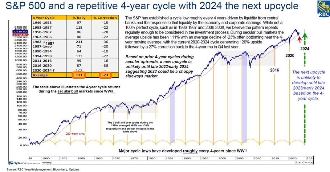 The medium length of a bear market is 19months, with a medium decline between peak and trough of 27%. The correction we have experienced in 2022 was largely a result of higher interest rates and multiple compression. Expected earnings however have been revised downwards alongside as well. Since 1930s, S&P has established a cycle low roughly every 4 years driven by liquidity from central banks and the corresponding impact on the real economy. If the 4-year cycle holds, 2023 will remain a very volatile year with the expectations of an early upcycle to form in late 2023/early 2024.