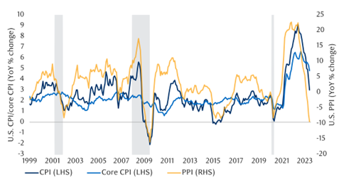 With economies normalizing against the backdrop of pandemic disruptions and geopolitical tensions, the U.S. and Canadian central banks have done most of the heavy lifting. Their future decisions will be more data dependent, meaning it will hinge on continued trajectory of inflation rates trending lower toward target. We have seen great progress made in headline CPI and PPI (Producer Price Index), but core CPI, which is an inflation measure given the most weight by central banks in decision making, remains well above their historical target rate of about 2%. While headline inflation has been coming down as expected, the next leg down in core inflation will likely be stickier and more difficult to materialize.