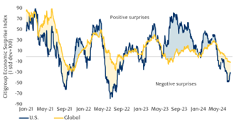 As of May 2024. Sources: Consensus Economics, RBC GAM As of July 2024. Sources: Citigroup, Bloomberg, RBC GAM