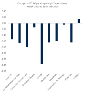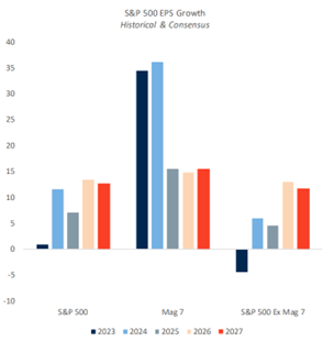 Earnings growth are forecasted to be modest in 2025 followed by stronger growth in 2026. The expectation is for the rest of the S&P500 companies to close the growth gap with the Magnificent 7 companies. There has been a significant shift in margin expectations in tariff sensitive sectors such as Energy and Consumer Discretionary.