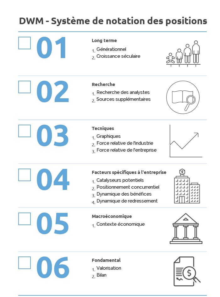 Lorsqu'il s'agit de sélectionner des investissements, nous tenons constamment à jour une liste d'idées. Nous établissons cette liste à partir de diverses sources, notamment des données provenant d’intelligence artificielle, la recherche des analystes, ainsi que notre propre exploration de l'univers des investissements.