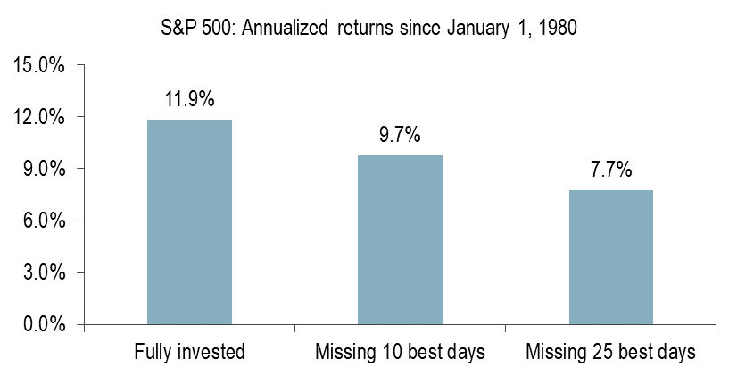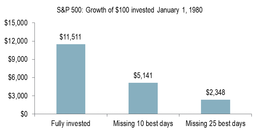 Mistiming entries and exits of the markets by only a few days can make a significant difference in returns. To illustrate the importance of remaining invested in market downturns, we wanted to share a chart we have referenced before, which shows the returns an investor would have generated by investing in the S&P 500 on January 1st 1980 under the following scenarios: remaining fully invested throughout, missing the 10 best days, and missing the 25 best days. This highlights the futility and risk of trying to time the market, as many of the “best days” actually occur during or in the immediate aftermath of downturns like we are seeing now.