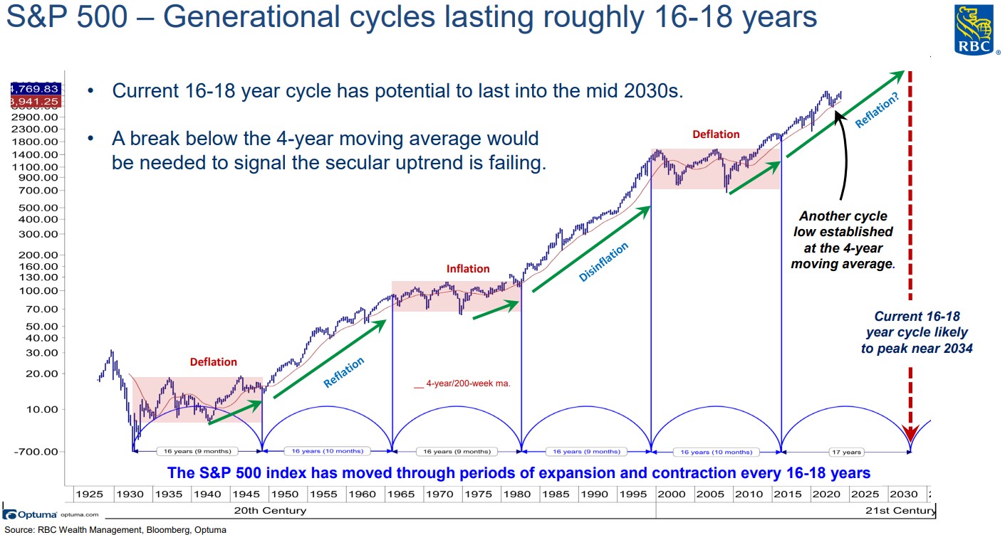 This theory demonstrates is that over the long-term, the S&P 500 is an excellent growth compounder. This is particularly true during the 16-18 year bullish cycles (in which we find ourselves today), but also true when looking at long-term returns that include a mix of bullish and bearish periods (ex. the 20 and 50-year returns listed below).