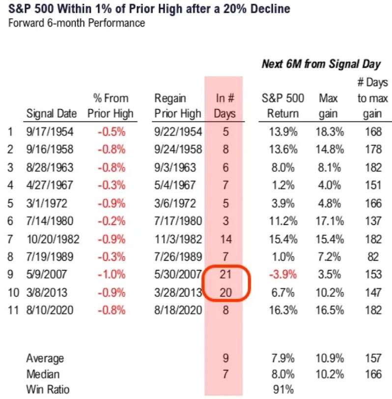 One of our favorite research firms, Fundstrat, put together some statistics about how markets perform following a return to all-time highs after a decline of 20% or more. Of the 11 instances of this dating back to the 1950s, the S&P 500 continued to move higher over following 6 months 10 of 11 times (and 7 of 11 times over the next 18 months).