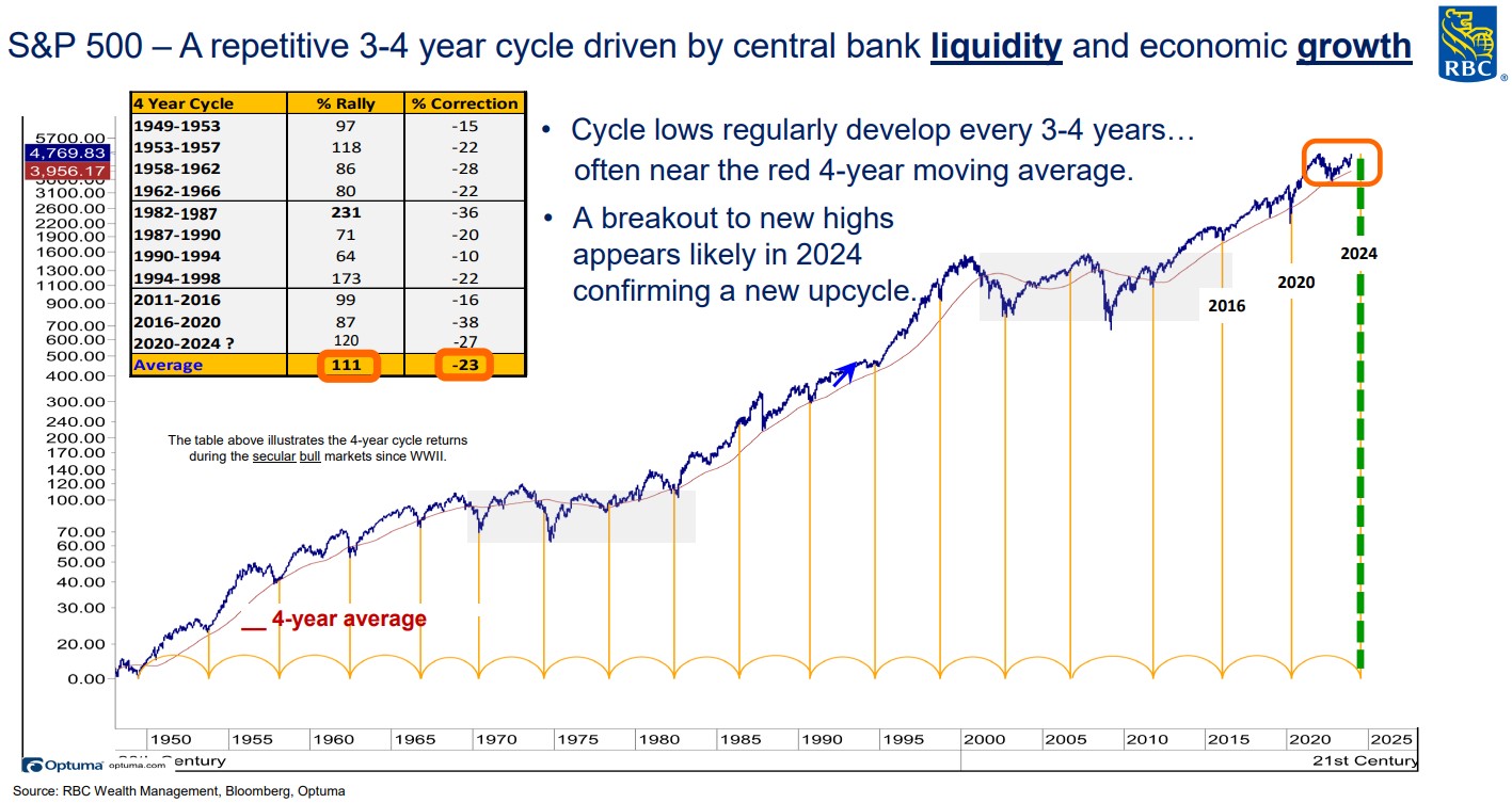 The unpredictability of markets was on full display in 2023. At the beginning of the year, the average projected closing level of the S&P 500 for 2023 was 4,078 according to strategists (a gain of 6.2% from 2022 closing levels). According to Bloomberg, by mid-December these same strategists had revised up their forecasts to an average of 4,750 (actual close of 2023 was 4,769.83).