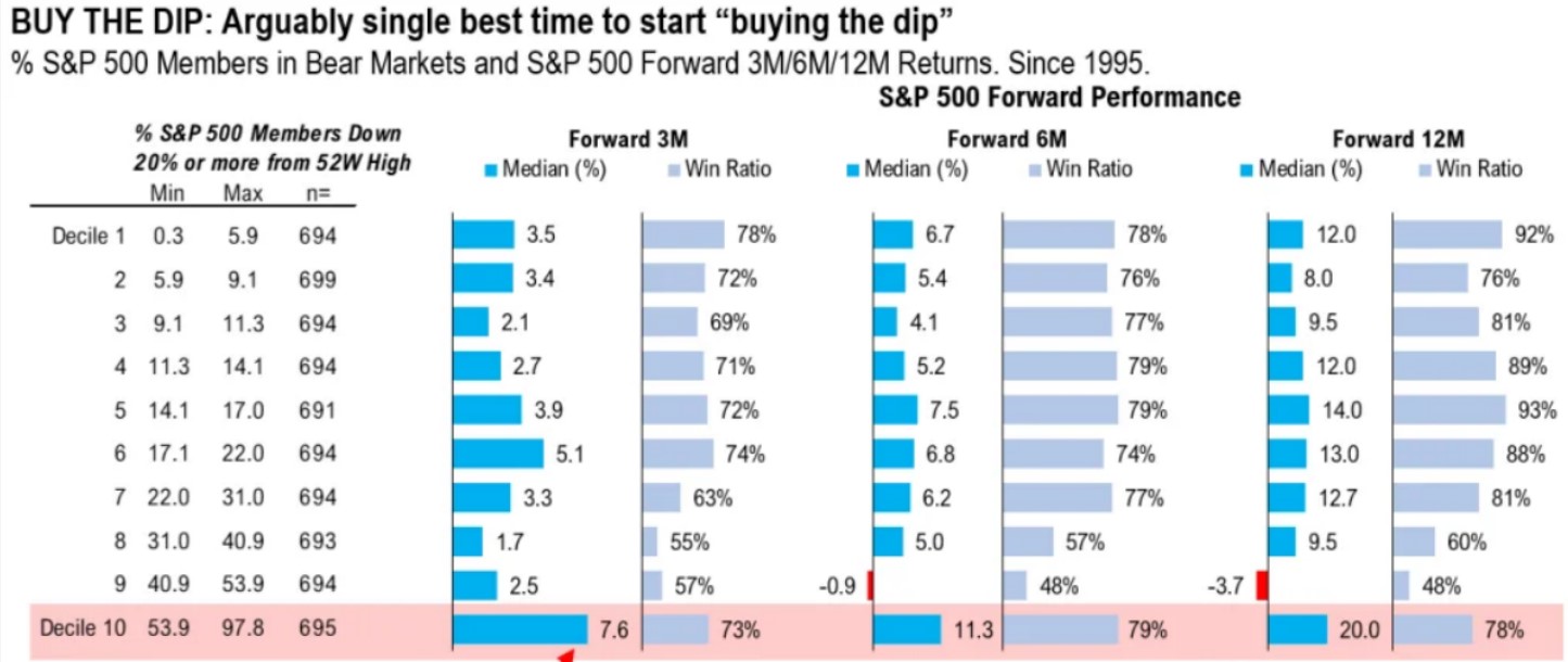 Sans surprise, compte tenu des faits évoqués ci-dessus sur les rendements à court et à long terme, acheter ou détenir des actions en période de volatilité est l’un des meilleurs moyens d’augmenter les rendements (ou d’accélérer les reprises) au fil du temps. Quelque chose que nous avons partagé pendant le repli du marché de 2022 explorait le type de correction que nous avions observé au cours de l'année, en le comparant à d'autres d'ampleur similaire et en projetant les rendements et les probabilités de succès au cours des 3, 6 et 12 mois à venir. Ce graphique est présenté ci-dessous – et les résultats réels reflètent les « moyennes » indiquées ci-dessous avec un haut degré de précision.