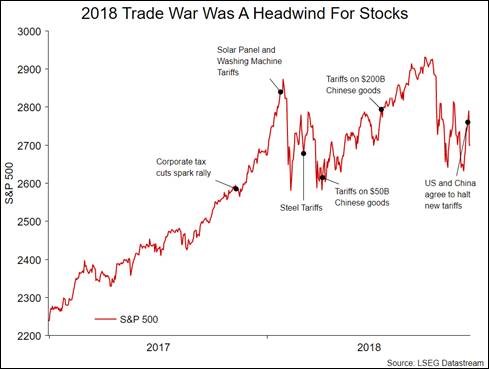 2018 redux?: By the end of 2017, Trump’s corporate tax cuts and deregulation plans boosted investor sentiment and lifted the S&P 500’s P/E ratio to its highest level since the Internet Bubble — similar to the current conditions. In 2018, when Trump began his tariff threats in earnest, the ensuing China-US trade war created a very turbulent year for stocks.
