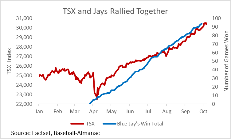 But just as the Jays quietly found their rhythm, so too did the markets. (We will let readers decide if this was causation or spurious correlation). As spring turned to summer, both delivered far more than most expected. From the tariff-induced lows, the S&P 500 and TSX indices have each risen about 35%, with the rally broadening beyond the usual handful of mega-cap tech names. What looked like a shaky lineup in April turned out to be a contender by September.